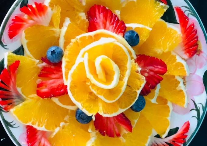 - Apfelsinen schälen und halbieren. In dünne Scheiben schneiden und auf Teller anrichten. Erdbeeren in dünne Scheiben schneiden, diese halbieren und einschneiden. Als Blatt fächern und verteilen..