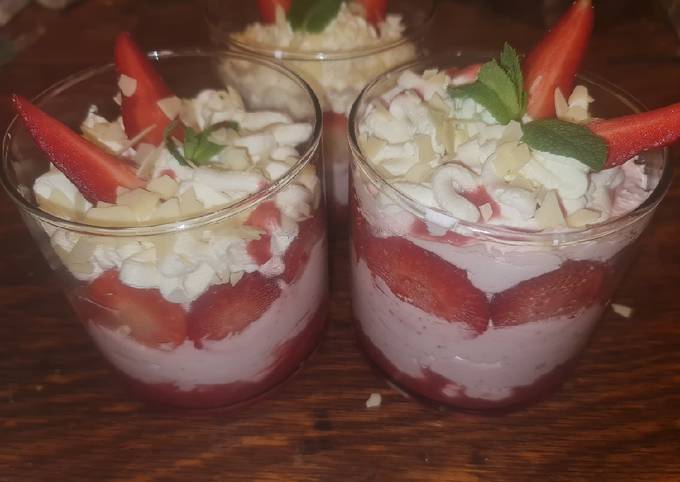 - Dessertgläser mit ungefähr der Hälfte der Mousse befüllen. Dann die Erdbeerscheiben am Innenrand rundum aufstellen. Vorsichtig die restliche Mousse darauf geben und das Dessert nach Belieben dekorieren und servieren..