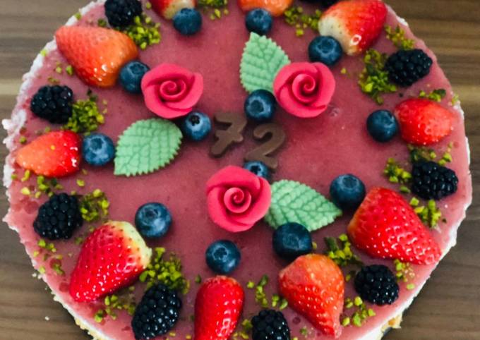 - Nach ca. 2 h restliche Erdbeeren halbieren und auf Torte verteilen. Mit Blaubeeren und Brombeeren je nach Geschmack schön anrichten. Ich hab noch Pistazien gehackt und schön verteilt. Da diese Torte für den Geburtstag gedacht war, habe ich noch Deko aus Marzipan verwendet..